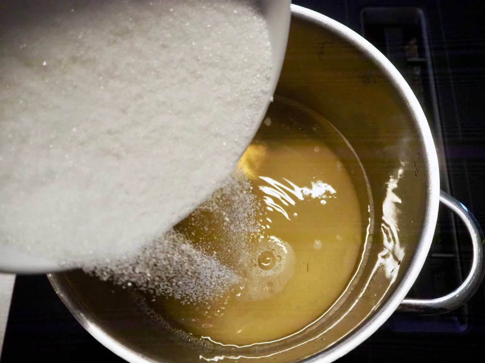 Danach wird es abgeseiht, der Zucker wird eingerührt, und alles zusammen wird aufgekocht. Fünf Minuten kochen lassen.