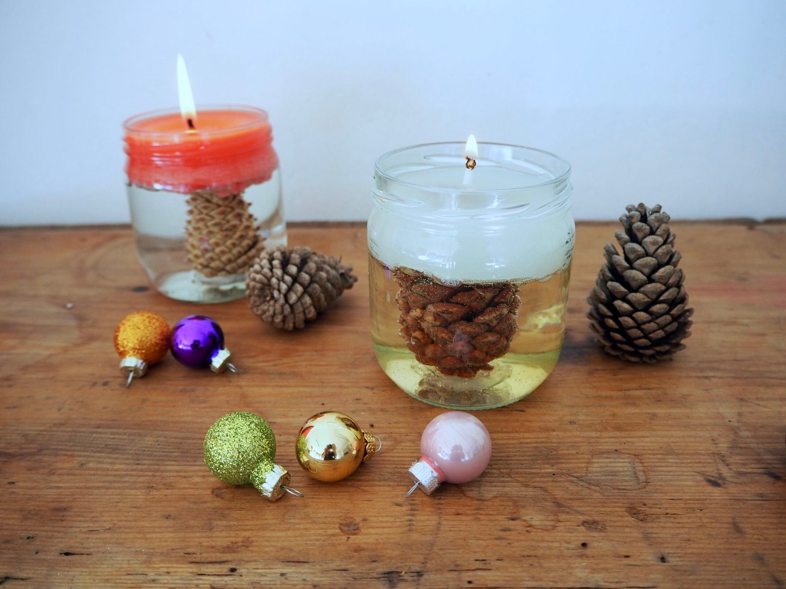 Der Tannenzapfen wird mit Heißkleber am Boden des Glases fixiert, der Docht oben am Zapfen angeklebt.